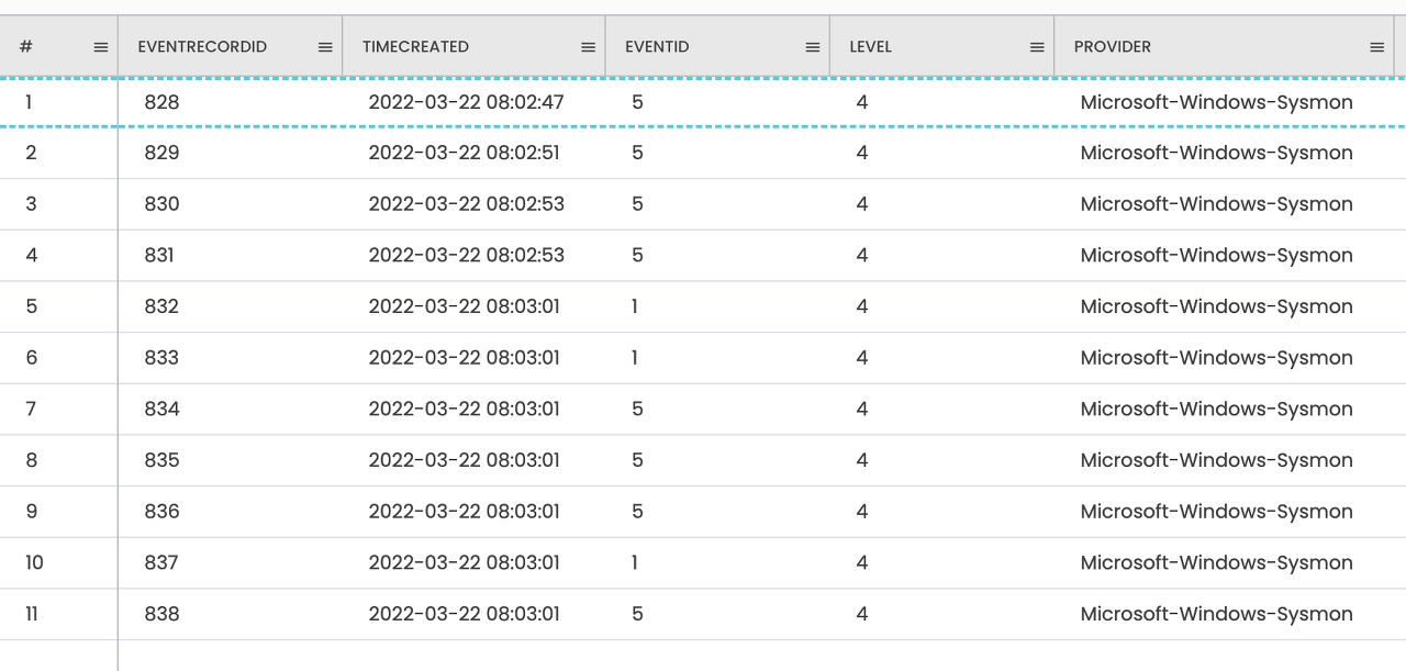 gigasheet 혹은 윈도우 내장의 evtx viewer를 이용하여 기록된 이벤트를 확인하면 EVENTID가 비정상적이라는 사실을 확인할 수 있다. 여기서는 어떠한 정보를 얻을 수 없을 것이므로, 다른 정보를 확인한다.